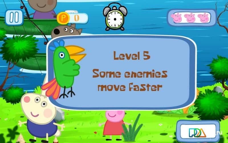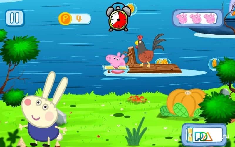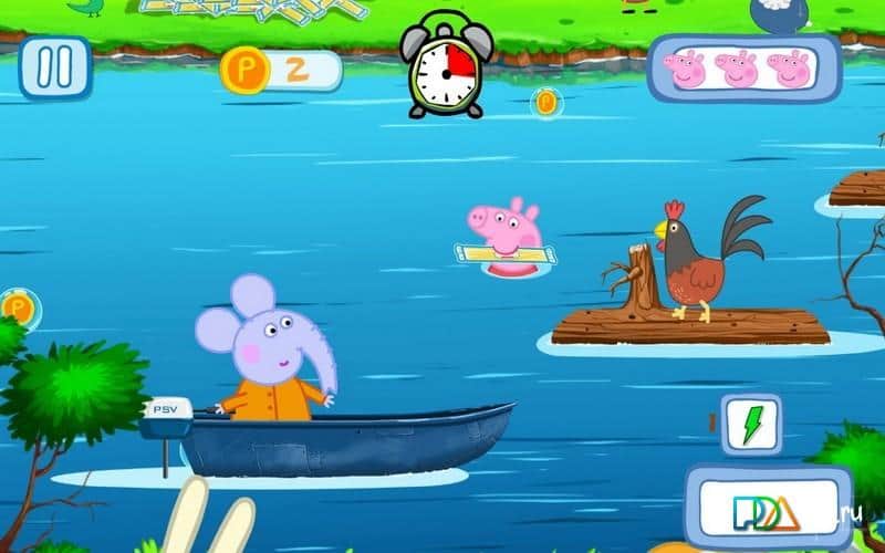 Peppa on the river - игра для детей в которой они будут помогать свинке Пеппе переплывать через реку обходя препятствия. Свинка Пеппи со своими друзьями отправилась на пикник к речке. Поиграв и попрыгав у реки, все друзья проголодались, оказалось что все продукты остались на другом берегу реки. Теперь вашей задачей будет помочь свинке переплыть через реку и перенести пачку со спагетти. На вашем пути будут вставать различные препятствия в виде лодок, птиц, крабов и рыб, так что будьте осторожны и внимательны. За раз вы сможете перенести только одну пачку со спагетти, а таких в каждом уровне вам потребуется четыре. В каждом уровне вам будет даваться четыре попытки, так что не медлите и быстрее переплывайте реку.
