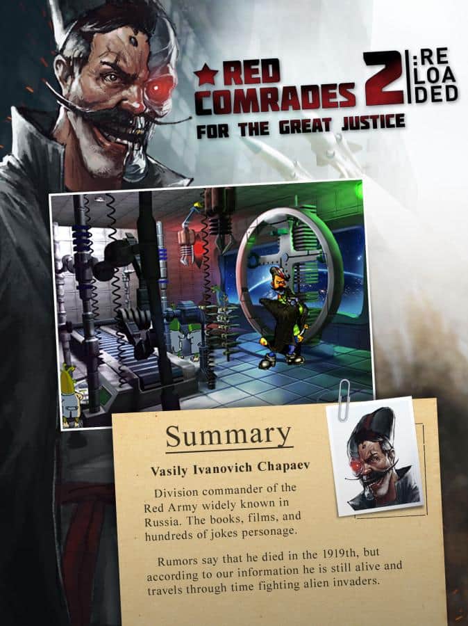 Petka and Vasily Ivanovich 2 – the second part of popular game for IOS where you immerse yourself in the atmosphere of sparkling humor and fun quests. This game takes you to 1917 where are you going to help the wounded Chapaev to cross the river at the time when the saving beam moved it to a space ship. Instead of die from enemy bullets, our hero returns to Earth as a terminator with the iron body. Then all the fun begins. Immerse yourself in the fascinating story of the game and help the main heroes of the game to solve tricky puzzles to solve exciting quests and try to destroy all his enemies.