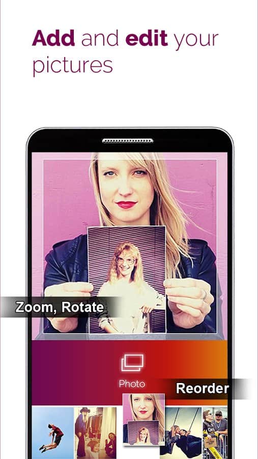 PicMotion - video slideshow is a great program that allows pretty simple to create videos with your favorite music, photos and even your own voice! In other words - create video slide show (Instagram, Vine, Youtube). The app has a number of useful functions such as photo editing, voice recording, set the time to start the song and display duration for each image, and many others.