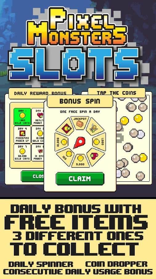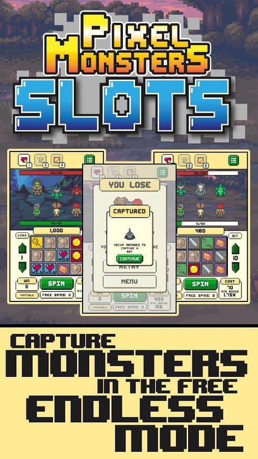 Pixel Monsters: Slots – RPG for Android where you will help the team of three characters to travel the dangerous world of this game. Lead your heroes forward and join the battle with numerous enemies and strong opponents. Attack enemies with the loss of various items, or defend yourself from the onslaught of monsters. In this game you try your luck and see if you can defeat all enemies by the loss of certain slots with attack or defense. Win embarked on your path of enemies and collect valuable objects and complete your collection of heroes new characters. Get many bonuses and defeat your enemies faster.