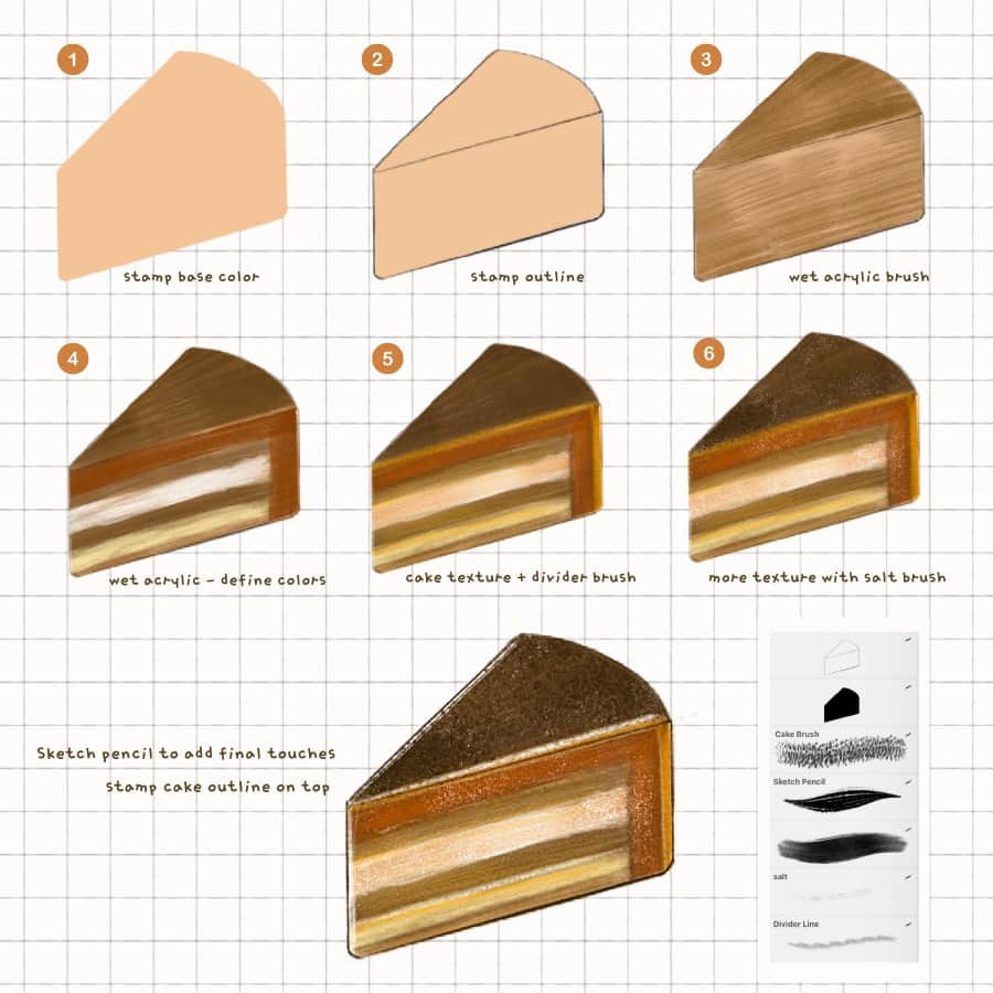 Procreate Cake Drawing kit - Now you can draw any piece of cake you wish! Forget forever that you do not know how to draw, even in electronic form, since this skill is not at all necessary for an interesting pastime. Now you have a chance not to draw pieces of cake from scratch, but to take ready-made sketches, adjust them a little to your needs, and then show the results to others. Try not just to use the set, but also to create new templates, making new types of cakes.