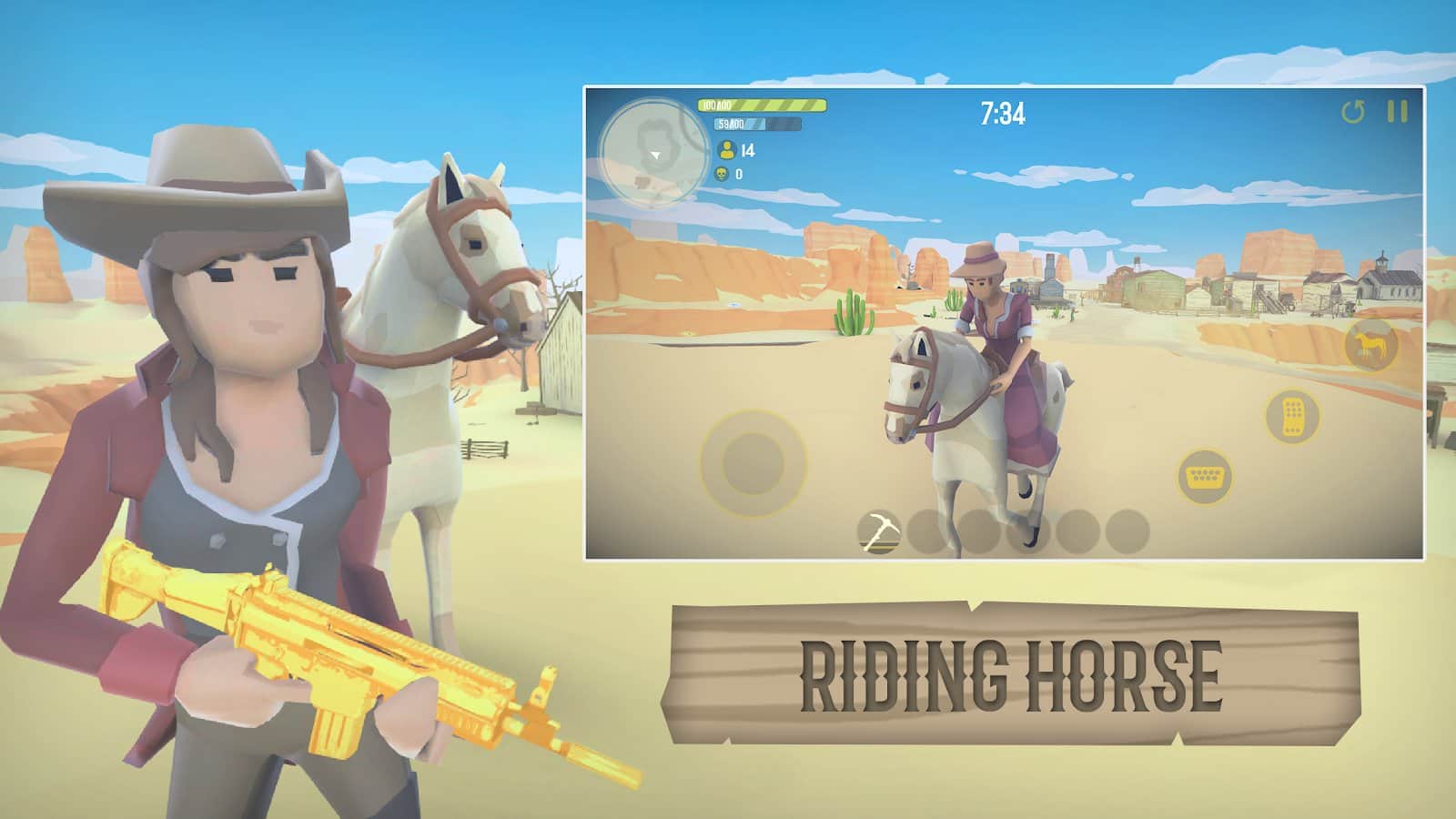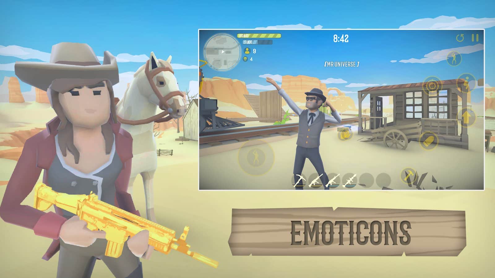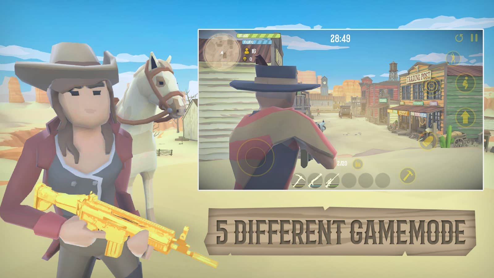 Red West Royale: Practice Editing – a fascinating shooter for Android, where you will be transported to the Wild West. In this game you will play the role of a bandit who came to the Wild West to fight with the enemies and earn money. Navigate through the numerous and diverse locations of the game and fire against the bandits. Use cover and assignments to protect themselves from the shots of opponents and not let them shoot you. Build various buildings and structures and challenge players from all over the world or fight against AI. Discover new heroes and check out all the game modes.