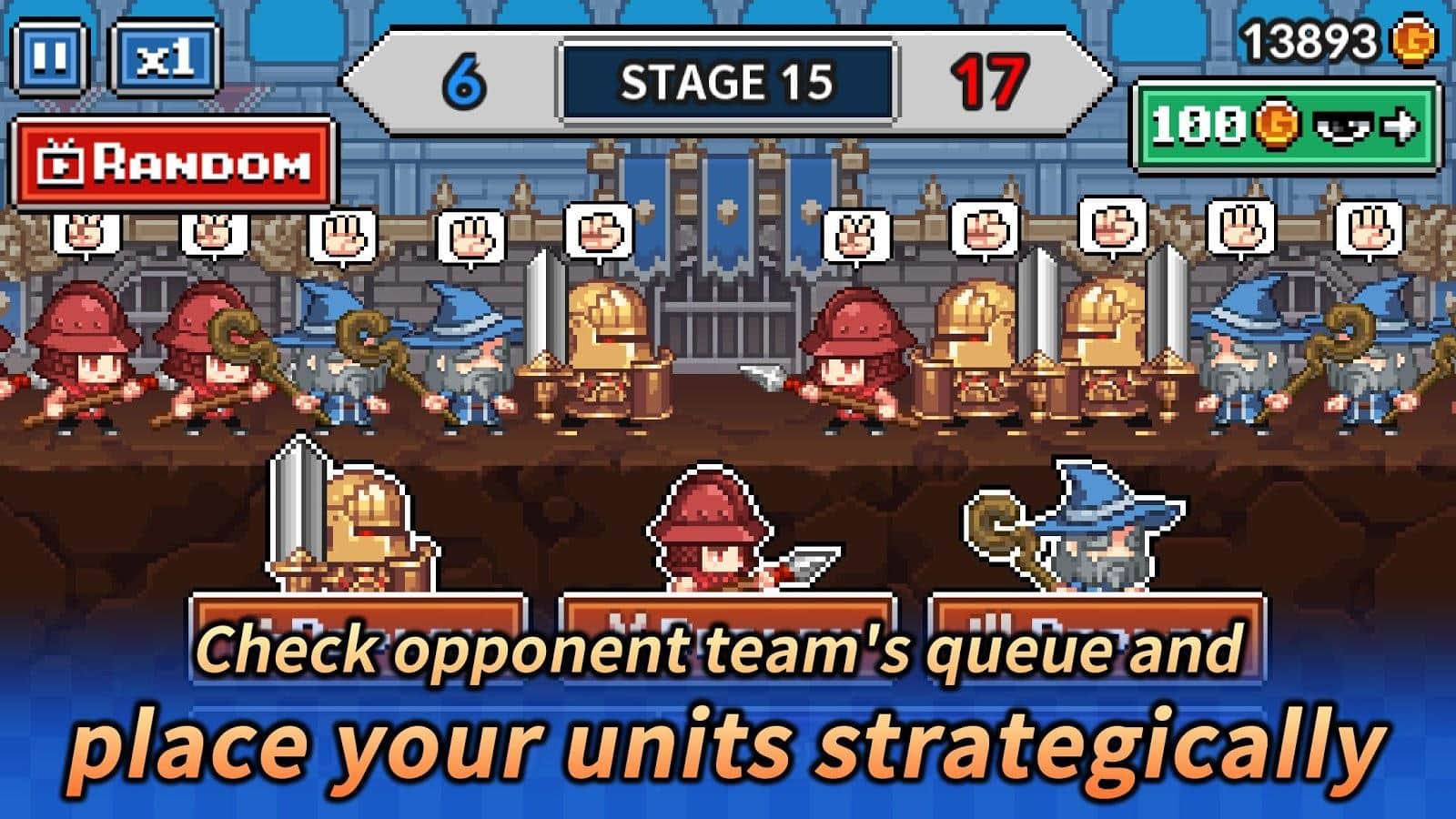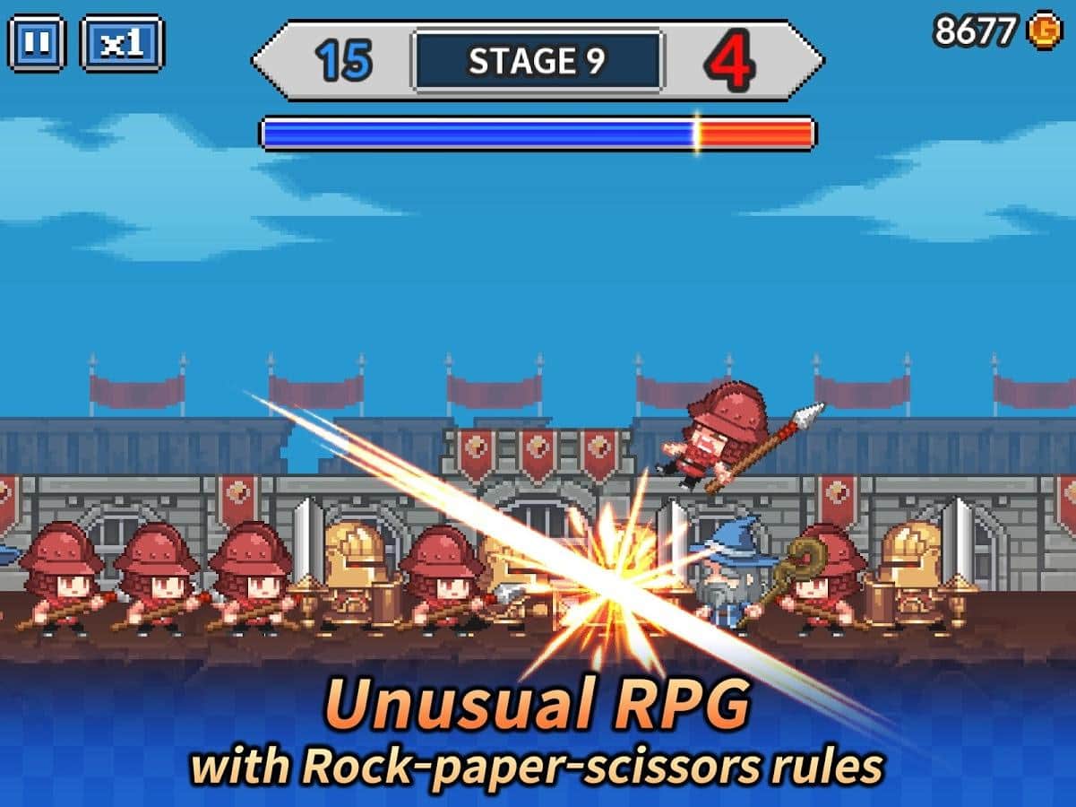 RPS Knights – a fascinating arcade on Android where you will line up their players on the field of battle and defeat opponents. This game resembles the famous game "rock, scissors, paper". The game also provides three kinds of characters that resemble these items. Place his characters and anticipate the moves of your opponent to defeat him. If your hero is defeated, he will automatically get off the field. Place fighters in a certain order and watch everything happening on the screen of your phone or tablet. Train your logic and your luck and win.