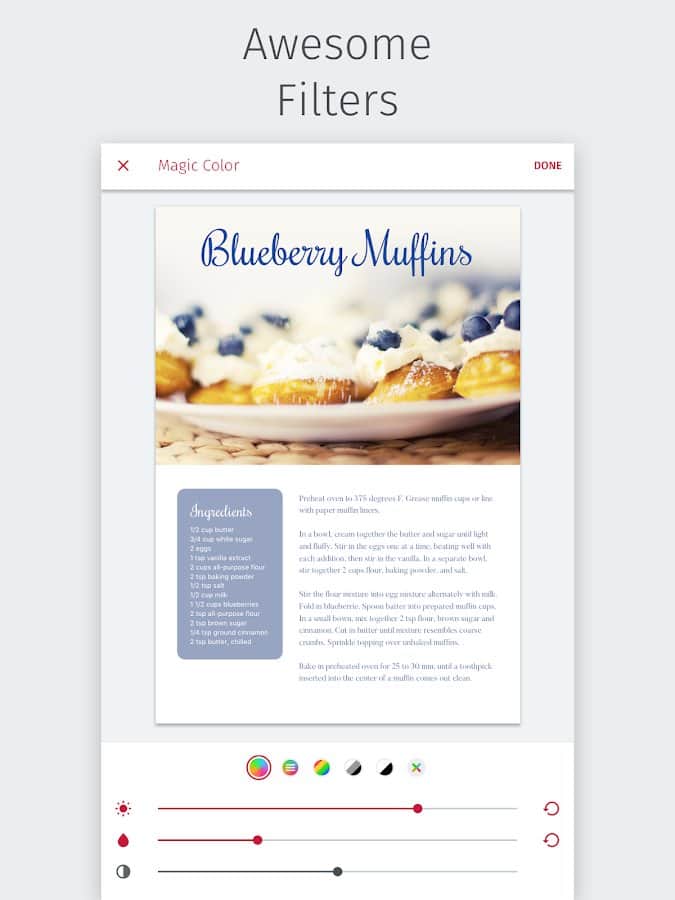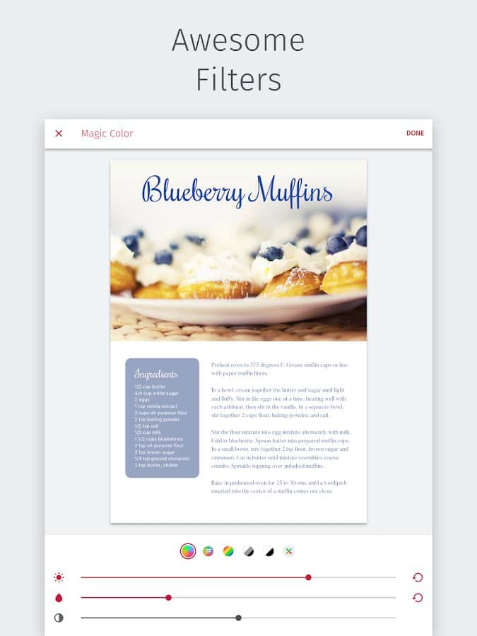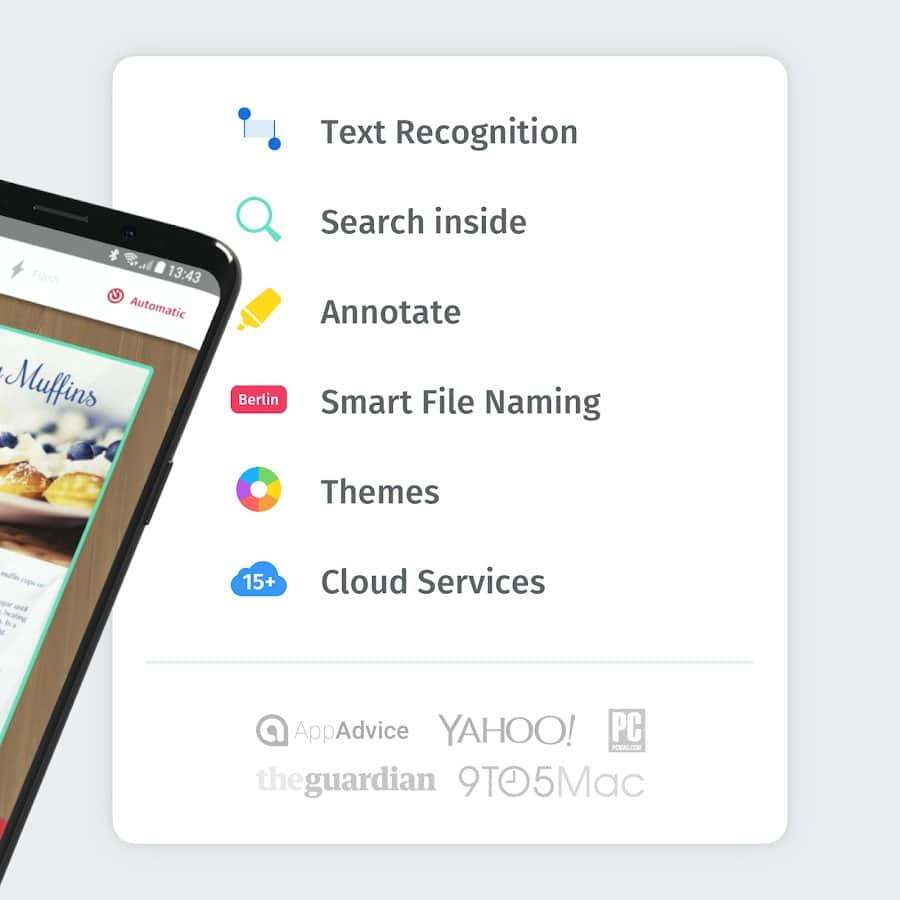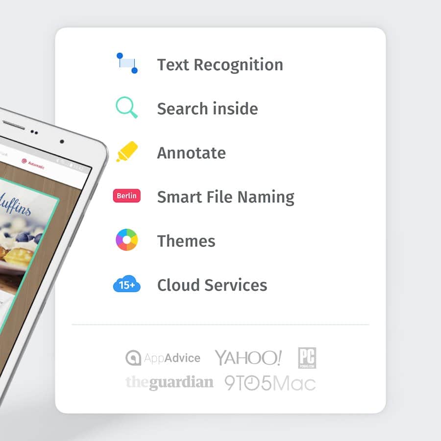 Wide features: automatic optimization of quality auto saving copies to the cloud, reducing blur, automatic detection of boundaries of the scanned document.