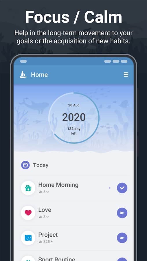 Sea Todo: Stay Focused - minimalistic, but complete assistant for both long and calm to your goals, or acquire new habits. You can create dolgosrochnye tasks or habits, and to note the progress in their implementation. For each task is dynamically calculated end date. Every day can be estimated by the degree of tranquility. While using the calendar you will have the opportunity to see how quietly and efficiently it all works out.