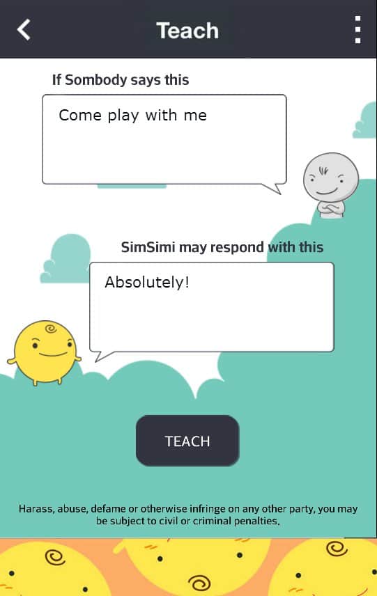 SimSimi - in the modern world there are so many different apps to communicate is and ICQ and agents, and Skype and much more. But all this is applicable if your circle of friends is great and always have someone to talk to. What to do if you have no friends or you want to chat with a virtual boyfriend, which is easier to tell about the sore. For these purposes, Chinese developers have created such a cheerful yellow bun, which is endowed with logical thinking and is able to hold a conversation! As it is implemented in the learning mode you can enter the passphrase question and then in the next field to enter the passphrase answer. Because a lot of people have installed this app, vocabulary bun is great! You can communicate in Russian, it's not a problem, so start chatting, and funny dialogues save in "quotes" to please them others!