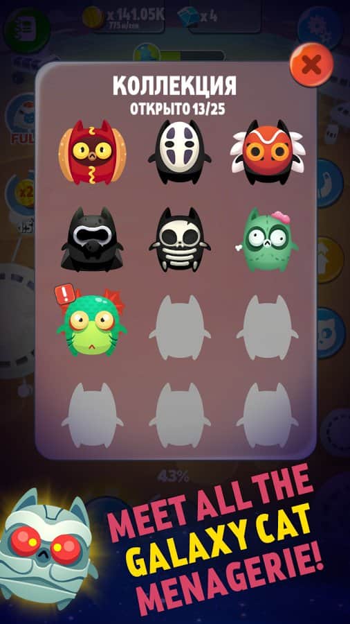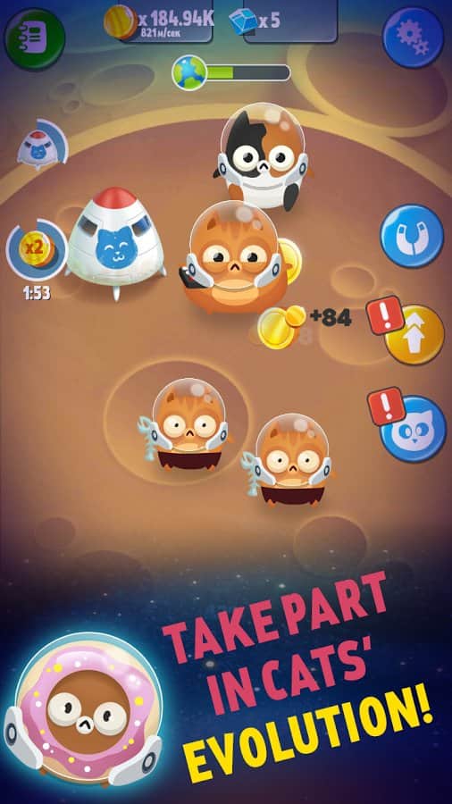 Space Cat Evolution: Kitty collecting in galaxy – clicker on Android, where you will evolve cats. In this game our cute cats decided to explore the vast galaxy and flew into space to settle new planets. Cats found their own planet and to occupy it, they need to evolve and thereby to obtain completely new types of cats. Click on one of the seals and match them, thus gaining the seals of mutants. Solve problems with the evolution of cats as quickly as possible and help them colonize a planet and make it a cat. Collect all the unique collection of the seals and discover a new planet.