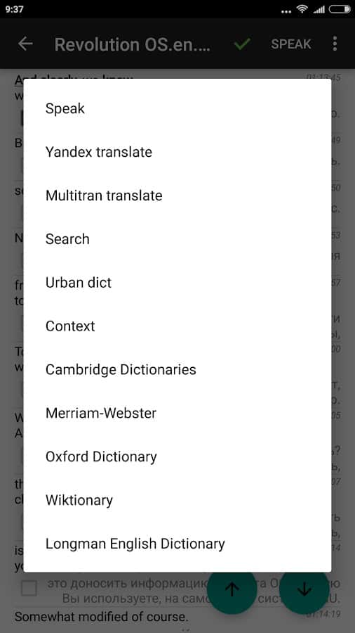 If you like to watch movies and TV series in original language with subtitles, and want to better understand other languages, then the app SrtDuoReader will suit you perfectly. Download it subtitles in formats like SRT and Xml DFXP, listen to the correct pronunciation of individual words, save unfamiliar words in the internal dictionary to later learn their meaning. The translation of a word automatically via the clipboard. You only need to copy the translation to the online dictionary and go back to the application. You will decide which online dictionary is preferable to apply, choosing from several available options.