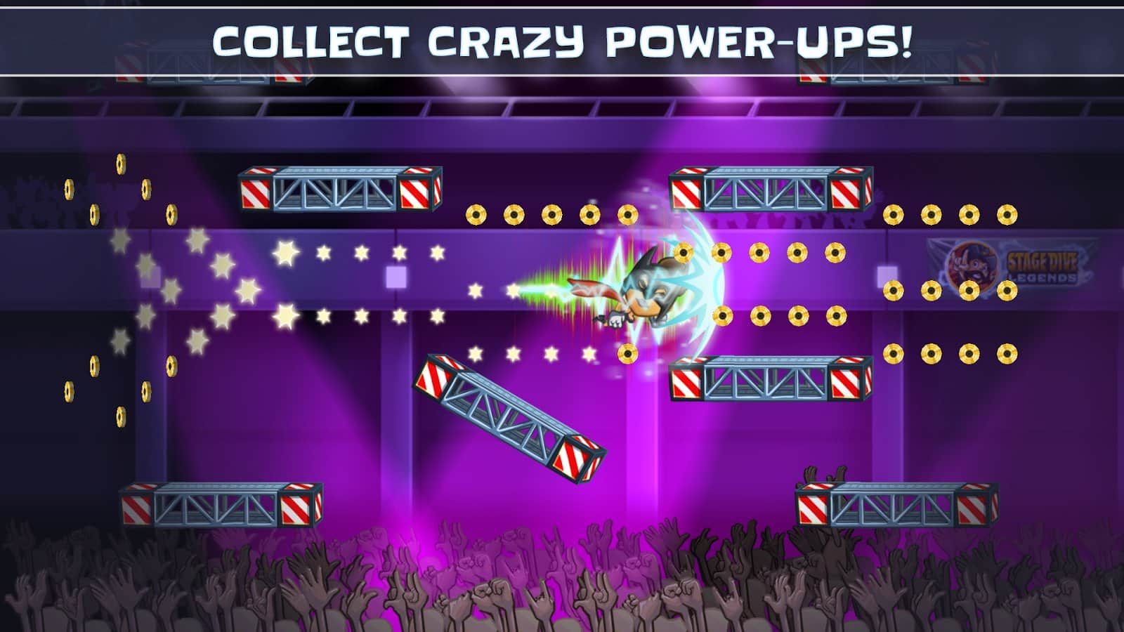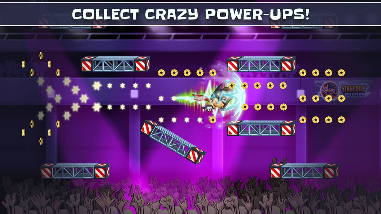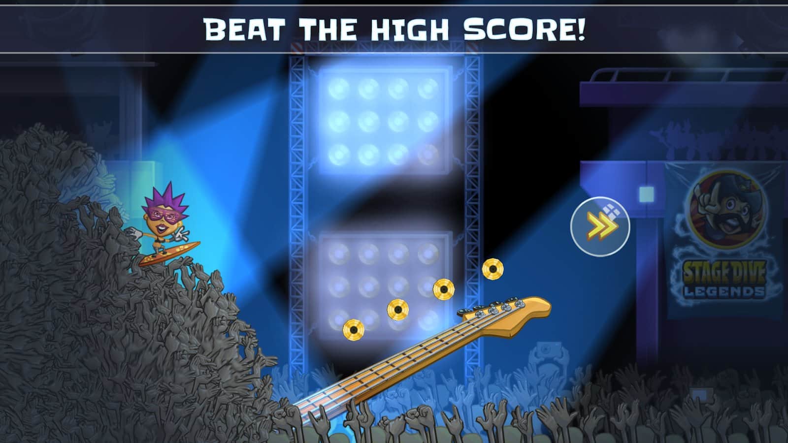 Stage Dive Legends - Embark on a magnificent tour to the most beautiful places around the world. Whether you are in new York, London, Berlin or Paris, everywhere you will find where you can spend your rock concert. Join the fun in this epic Saga about a rock star and experience the most legendary events in every rock show: the stage dive. Smash your guitar, speed up and jump into the presence of the crowd. Rush through the concert hall and feel the love your fans. Perform crazy stunts, collect Golden highlights and encourages gathered on the festival crowd! Avoid flying obstacles, such as bananas, half-eaten burgers. Stage Dive Legends is a super =fast runner game that brings a lot of joy and fun. Don't forget to improve your favorite rock star and beat all with victory. Become a true legend of stage dive!