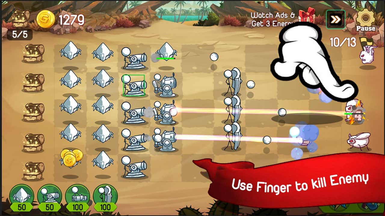 Stickman Defense: Cartoon Wars - an Amusing strategy in which you will defend from various monsters. The goal in this game is quite simple, there are several types of troops, and a few lines, you build protection from the enemy and block them. It is very important to understand the strategy otherwise you will quickly lose. The essence also is that right to place its troops and those characters that get the gold, because with each wave the enemies will become stronger, and without improvements and new types of troops you can not win!