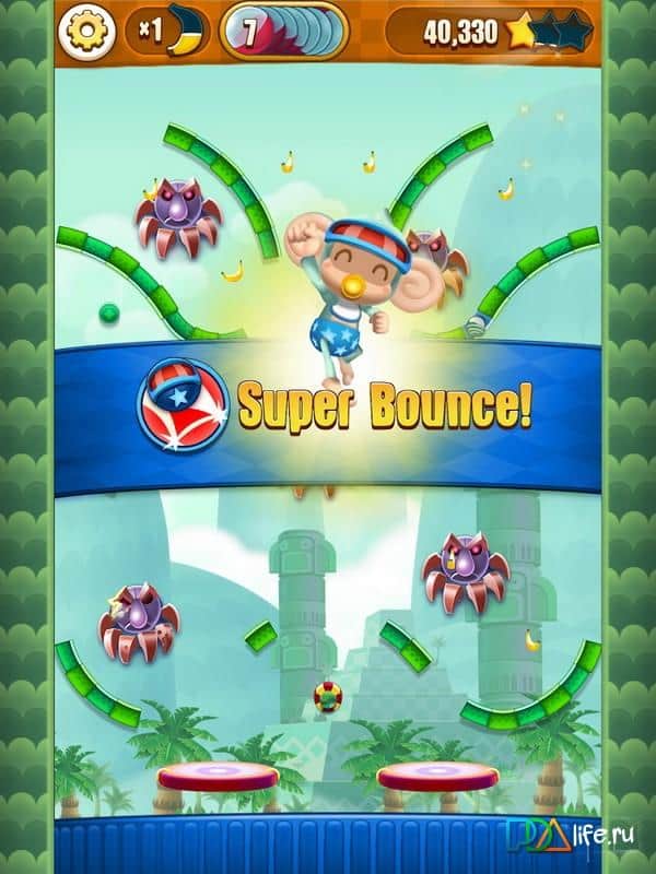 Super Monkey Ball Bounce - arkanoid game from the company SEGA, returns in a completely new design. Go together with a monkey AIAI to a funny journey in search of her friends. Make a dizzying jumps, starting from the moving platforms and glide across the grooves and spirals, collecting as many bananas and bonuses. Offers a variety of worlds, ranging from the jungle and ending with volcanoes and glaciers, as well as a large variety of levels with increasing difficulty.