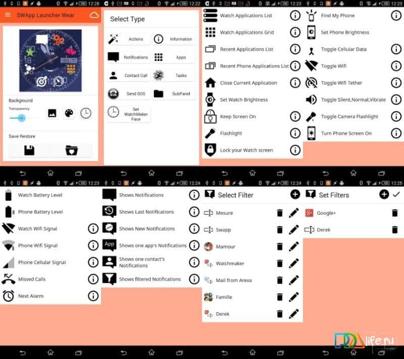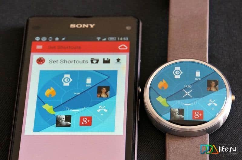 Launcher for Android Wear extends the basic functionality of the OS. Allows you to select one of several custom dials, lock screen clock, launch applications, view the list of installed programs and recently launched apps like the clock and phone. A built-in flashlight (screen totally filled with white light). And still have the ability to quickly send an SOS message. No less interesting and manage your phone settings with hours: change quick settings, FindMyPhone, to activate the screen etc.
