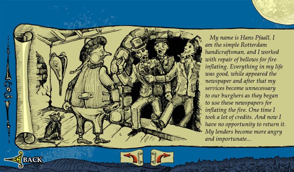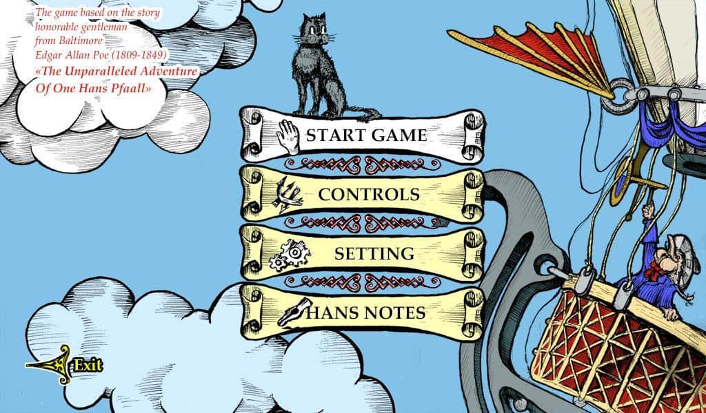 The Unparalleled Adventure of One Hans Pfaall - a game on Android on the short story by Edgar Allan PoE. Where the main character Hans Pfaall went to adventure on a hot air balloon to the moon. It lies in wait for sea of dangers from enemy attack to unpredictable obstacles. As you progress through the 4 levels you will open the picture from the diaries of Hans, where he wrote that happened to him during the dangerous journey.