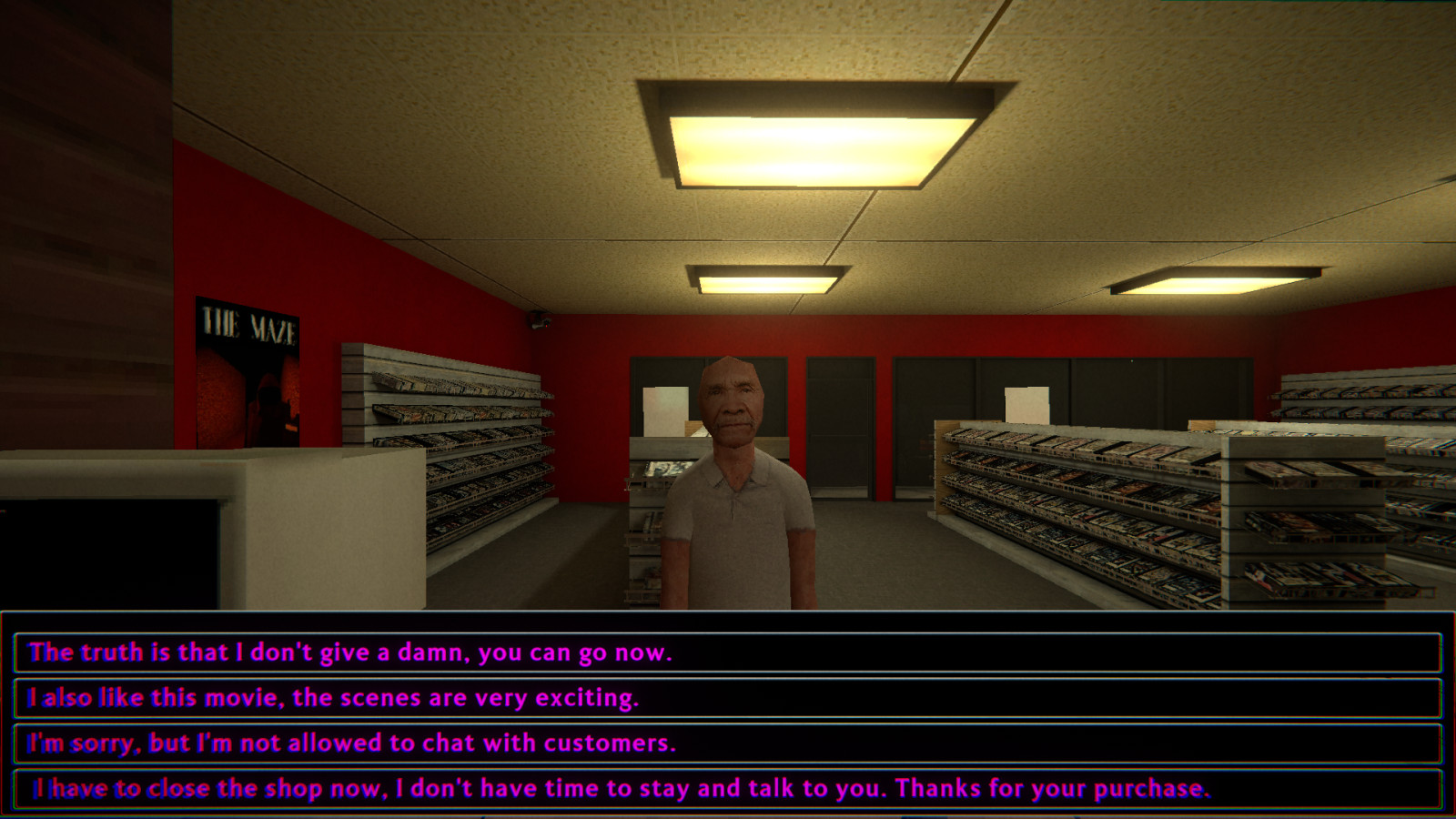 THE VHS PARADISE - a short horror film with 3 different endings and lots of hidden surprises! You play as Robert, a clerk at a video rental store, and your job is to serve customers during the night shift. But stay alert! The city is rife with crime, and the streets are filled with the strangest characters. Will you be able to finish your shift in peace, or is something more sinister waiting for you? Explore the store, interact with the visitors, and try to uncover the mysteries of the night as you discover different endings!