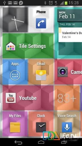 Tile Launcher Beta – beta version of the launcher with tile interface for Android devices based on Jellybean 4.2 Launcher from the developer ROB43. Help: horizontal scrolling, custom Wallpaper, with adjustable the name, text color, background color, image, transparency of shortcuts and widgets, options for scrolling Wallpaper, and the ability to change the Wallpaper, the frequency of rows/columns, gap size between tiles, and more.