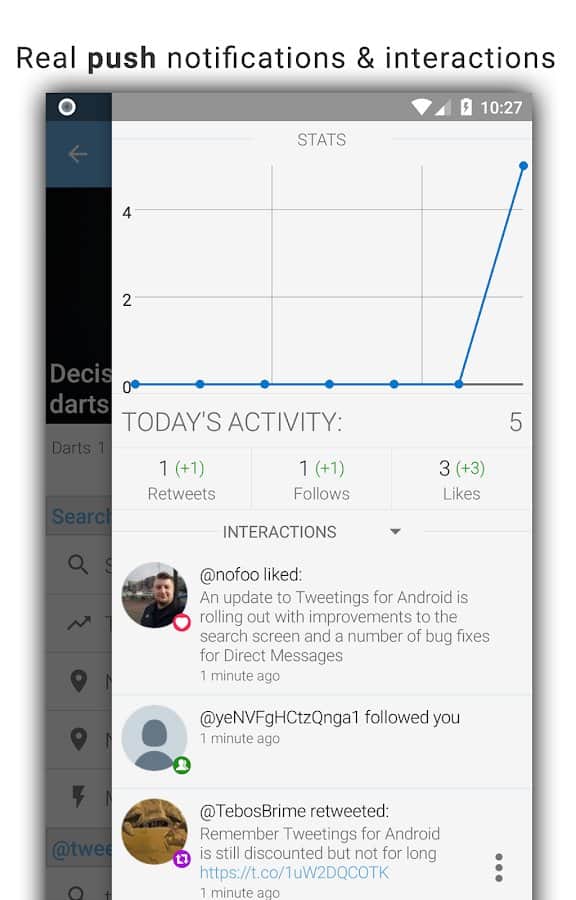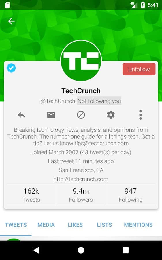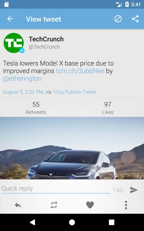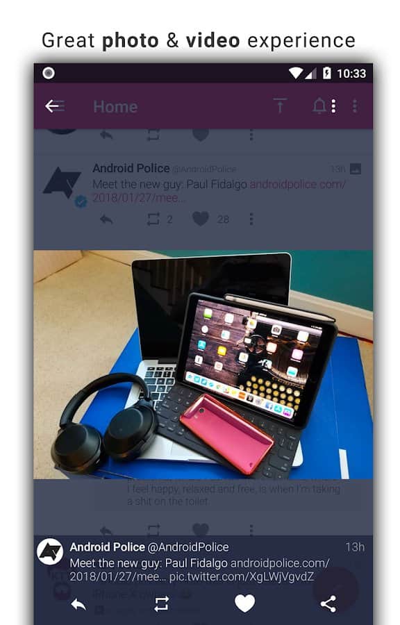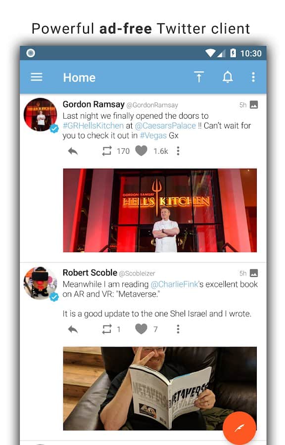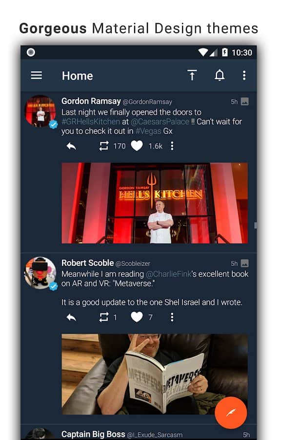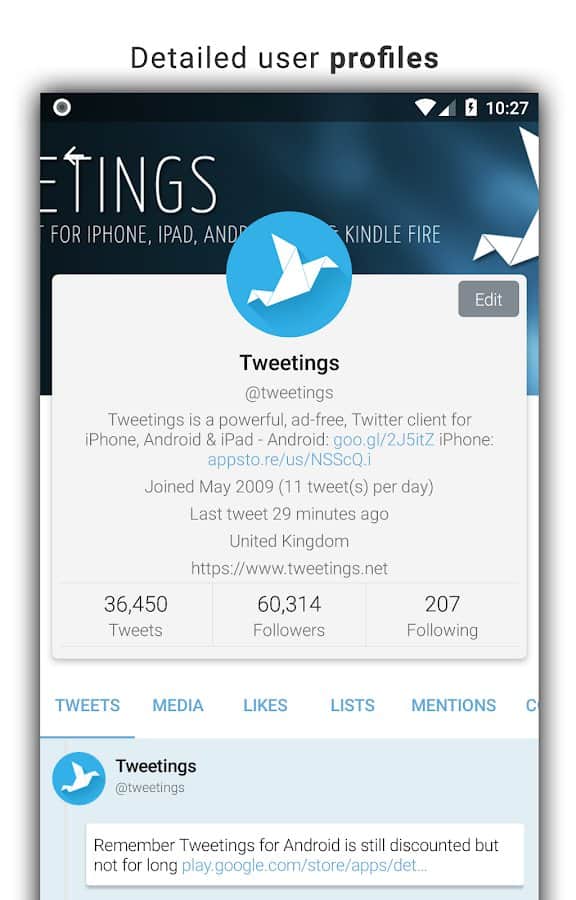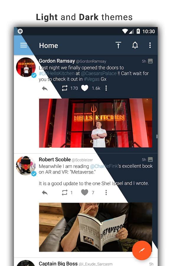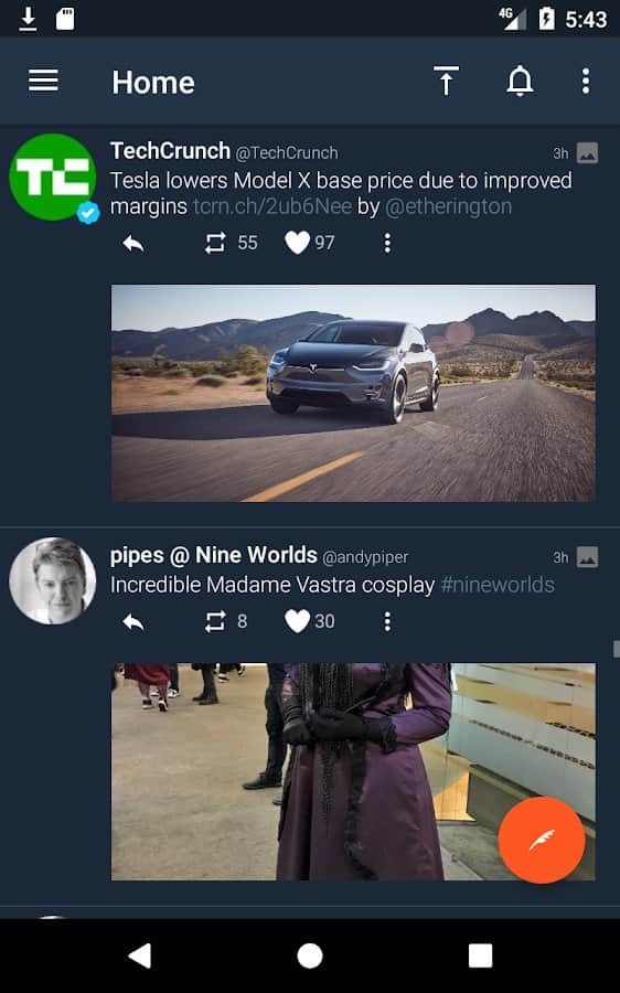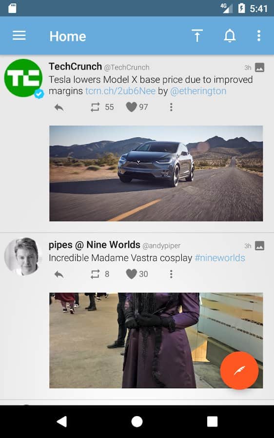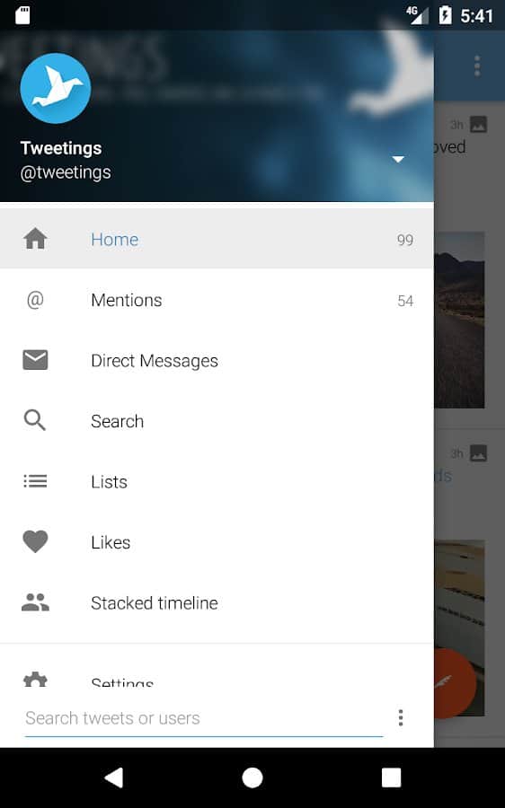 Tweetings for Twitter - Another Twitter client for Android, has a beautiful view. The app supports themes, so you never get bored of its appearance. You can read your favorite tweets and post your in one of the most convenient Twitter client. The program has easy control, in which you'll not long to understand.