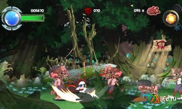 The characters are drawn in the style of Japanese comics (well, manga), and the action takes place amid breathtaking scenery. When playing it is impossible not to pay attention to the wonderful background, and immediately felt a huge work done by artists and designers. In most similar games, the scenery is given much less attention, and the player usually does not notice them at all, continuing to chop enemies in the cabbage. Twin Blades – it is quite another thing. This game magically makes unrequited love with your hand drawn levels, and sometimes stop to enjoy their beauty. To diversify the gameplay, the developers have dressed up some zombies – now they proudly wear Hawaiian shirts, floral (and not only) pots and pans. And you expect a fairly interesting boss fights, and the sounds and music, combined with graphics make the game really fun.