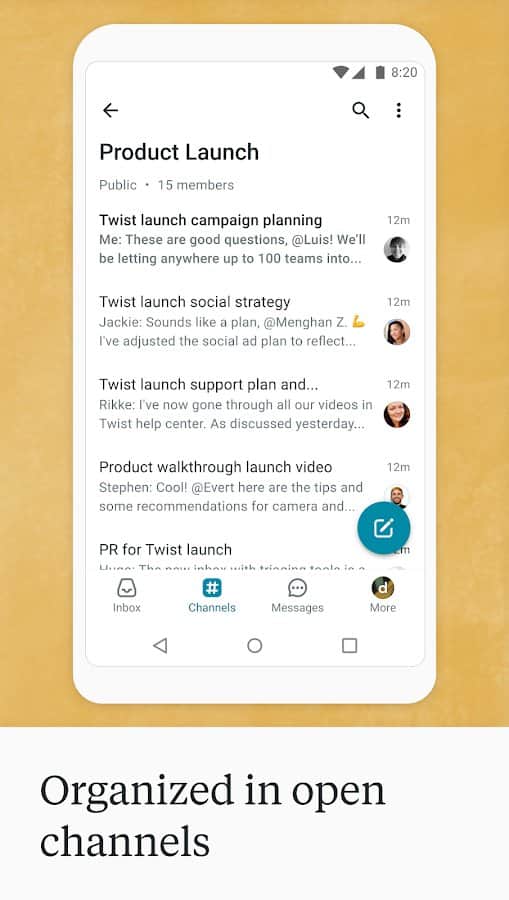 Twist: Team Messenger - Fully organize work with your team and create a shared chat where each of the employees will be able to write online. Sort the threads by channels, close the threads and leave links to their conclusions, communicate with colleagues in personal chats, synchronize all messages and do not be distracted many times by incoming messages. Now you just won't be able to miss something important, because new notifications will be shown at the very top of the entire list. Invite new users to discuss common projects and scroll through the history of correspondence to find the necessary details.