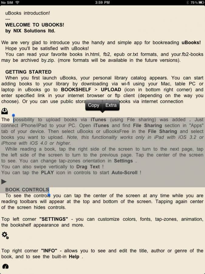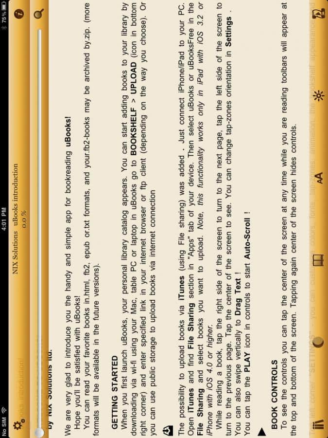 uBooks – удобная читалка книг теперь и в вашем телефоне с операционной системой ios. Это приложение имеет самый удобный и комфортный для ваших глаз экран, интересную и неповторимую книжную полку, где будут размещаться все ваши книги, а также легкую загрузку книг и документов через wi-fi или FTP-клиент. Используйте это приложение и получайте огромное удовольствие от разнообразных параметров по изменению цвета фона, размера шрифта, типа шрифта, удобной прокрутки и многих других параметров, имеющихся в этом приложении. Применяя это приложение для чтения книг, вы по достоинству оцените его возможности и настройки.