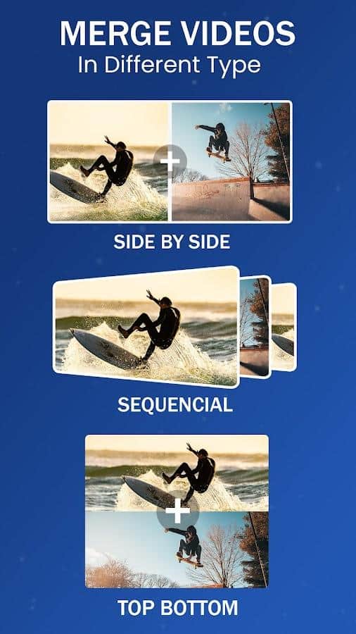 Video Merger, Joiner, Trimmer - Get one video by connecting several of the uploaded video files! In total, there are three ways to do this in the application: side by side (horizontal stack), top to bottom (vertical stack), sequential (performance one after the other). The editor supports combining videos of different formats (mp4, mkv, 3gp, 3gpp, mov, flv, avi, mpg, mpeg, m4v, mpeg, vob, wmv, webm, mts, ts, m2ts), bitrate, frame rate and more. The application, in turn, compresses the video by default, maintaining the highest quality.