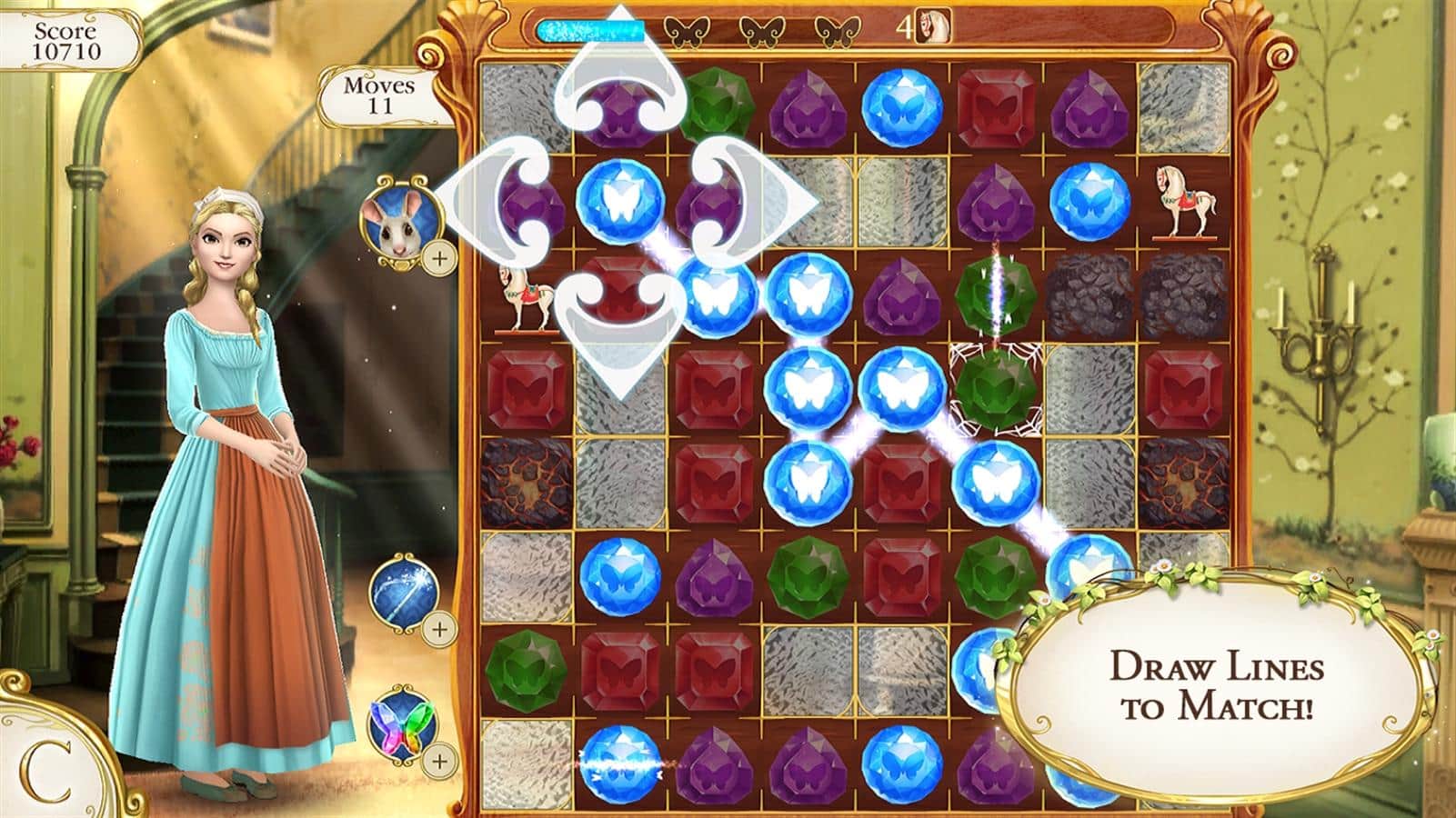 Золушка. Звездопад – увлекательная игра из жанра «три-в-ряд», в которой вы проследите всю историю золушки. Эта игра продолжает серию игр от Disney "Холодное сердце. Звездопад"" и ""Малефисента. Звездопад". Погрузитесь в сказочную атмосферу этой игры и помогите золушке собрать одинаковые кристаллы в ряд и получить волшебный узор который откроет дополнительную магию желаний с небывалыми возможностями для нашей героини. А если замкнуть все узоры в круг то увидите удивительные эффекты. Призывайте на помощь лесных зверей и бабочек, чтобы расчистить столбики с камнями или убрать определенный камень. Проследите историю юной золушки и посмотрите ее превращение в чудесную принцессу.