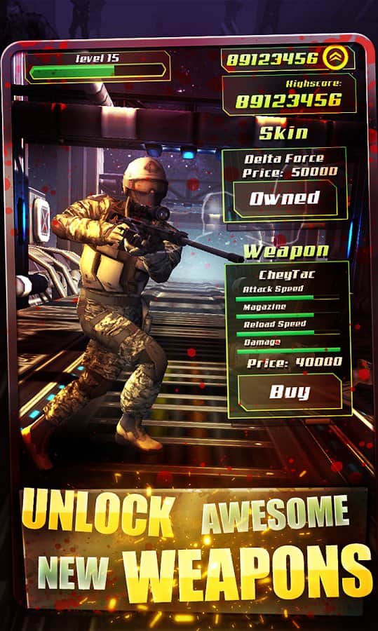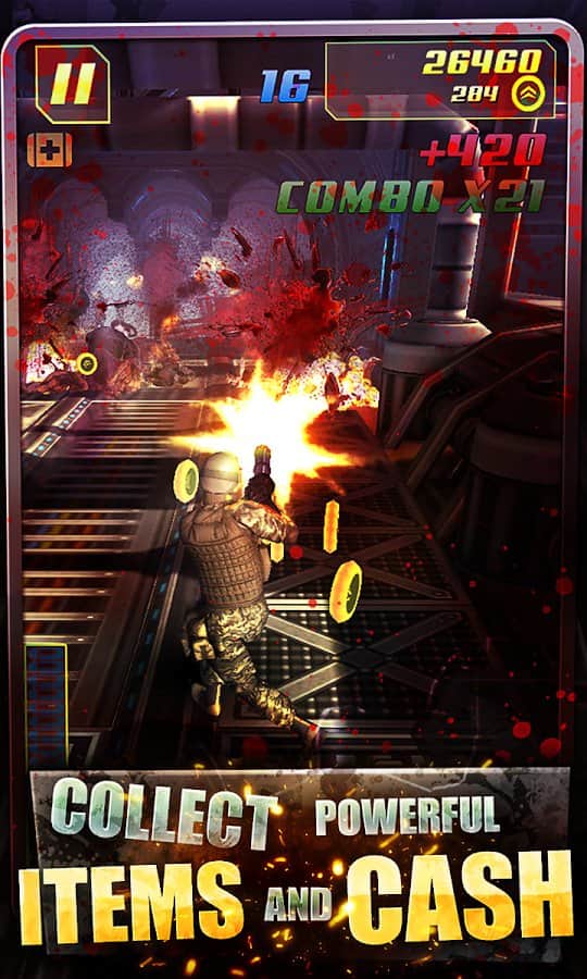 Zombie Apocalypse Gear Marines – раннер на андроид, где вы возьмете в руки автомат и будете убивать зомби. В этой игре вы возьмете на себя роль отважного пехотинца, которому выпала не простая миссия очистить космический корабль от зомби. Космический корабль, которому предстояло лететь на далекую планету престал отвечать, командование приняло решения послать туда бойца пехоты, чтобы узнать что на самом деле там случилось. Бегайте по отсекам корабля и уничтожайте всех членов экипажа, которые превратились в ужасных зомби с помощью мощного оружия. Уничтожьте всех зомби и очистите корабль от зомби, не давая им укусить себя. Зарабатывайте деньги и приобретайте новое снаряжение для бойца и различные костюмы.