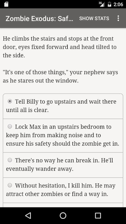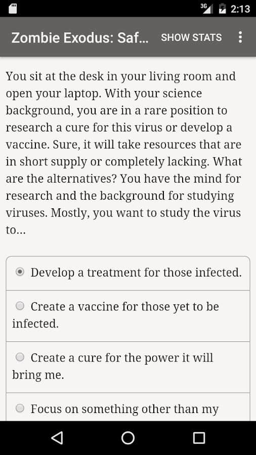 Zombie Exodus: Safe Haven is an interactive novel on Android where you will play the role of survivors after a zombie Apocalypse. In this game you will be able to choose your character, it can be a ruthless thug, a robber, a paranoid hacker, psychopathic con man, pragmatic idealistic, a scientist or a teenager. The game's plot will begin from the first days of the Apocalypse where you have to survive in extreme conditions and do your best to stay alive. The game is completely based on the lyrics in it you will find animations and sound effects, and will be fueled by your imagination.